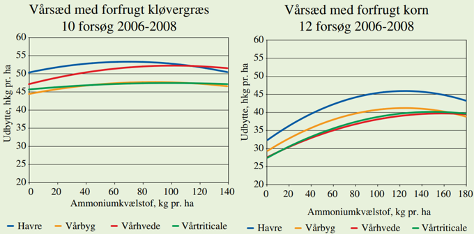 Responskurver for tilførsel af ammoniumkvælstof til havre, vårbyg, vårhvede og vårtriticale med forfrugt kløvergræs til venstre og forfrugt korn til højre. Klik på billedet for at forstørre det